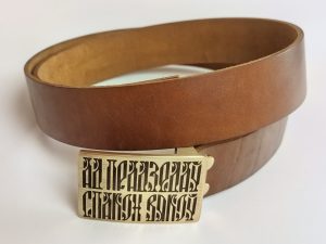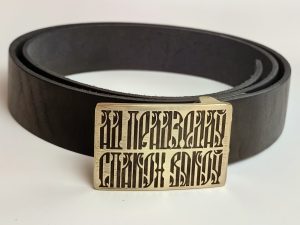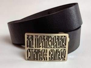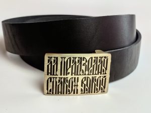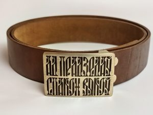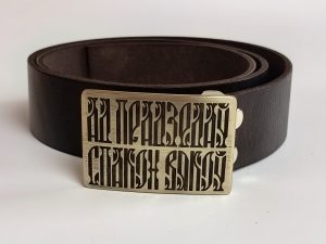• Літая спражка з выявай стылізаванага тэксту “Ад прадзедаў спакон вякоў” (выдатная якасць). Памеры спражкі звонку: 70*46 мм.