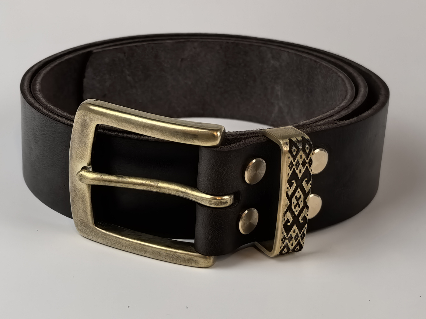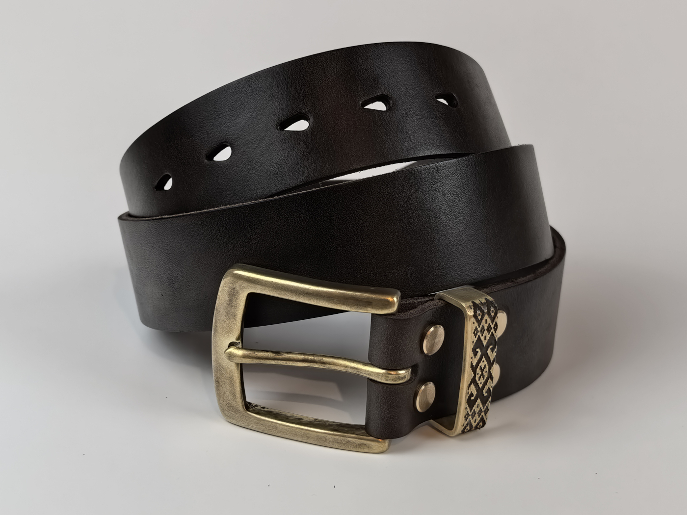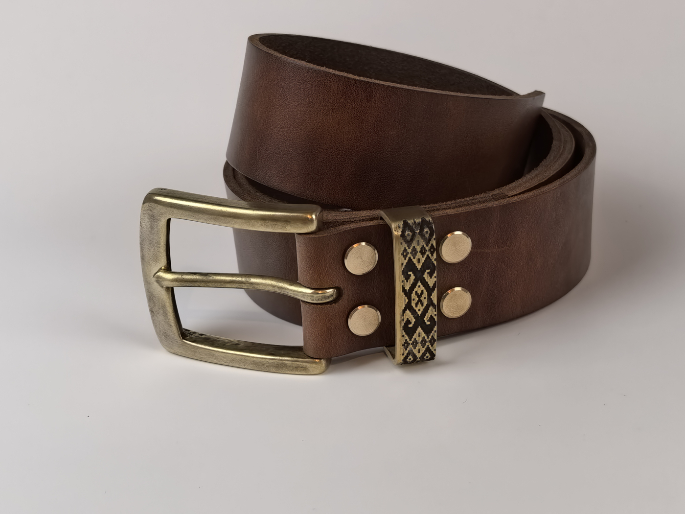 • Літая спражка, ніты і трэнчык з латуні (выдатная якасць). Памеры спражкі звонку: 65*53 мм. Пры выкарыстанні прыгожа старэе, пакрываючыся пацінай, і блішчыць у месцах трэння.