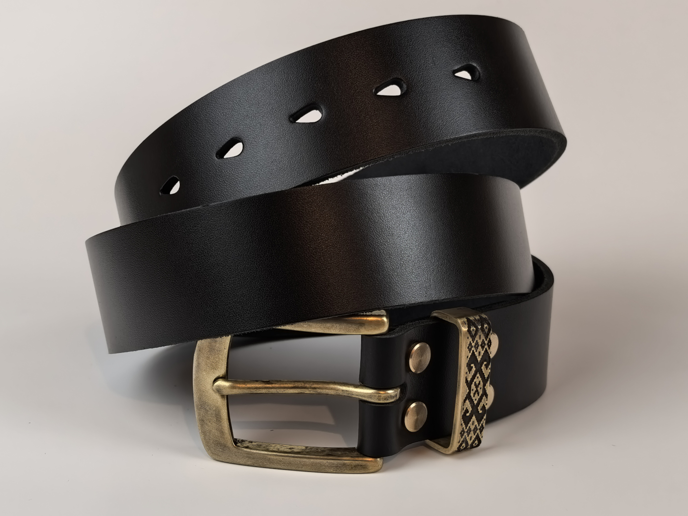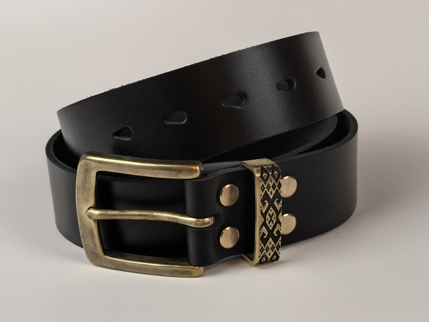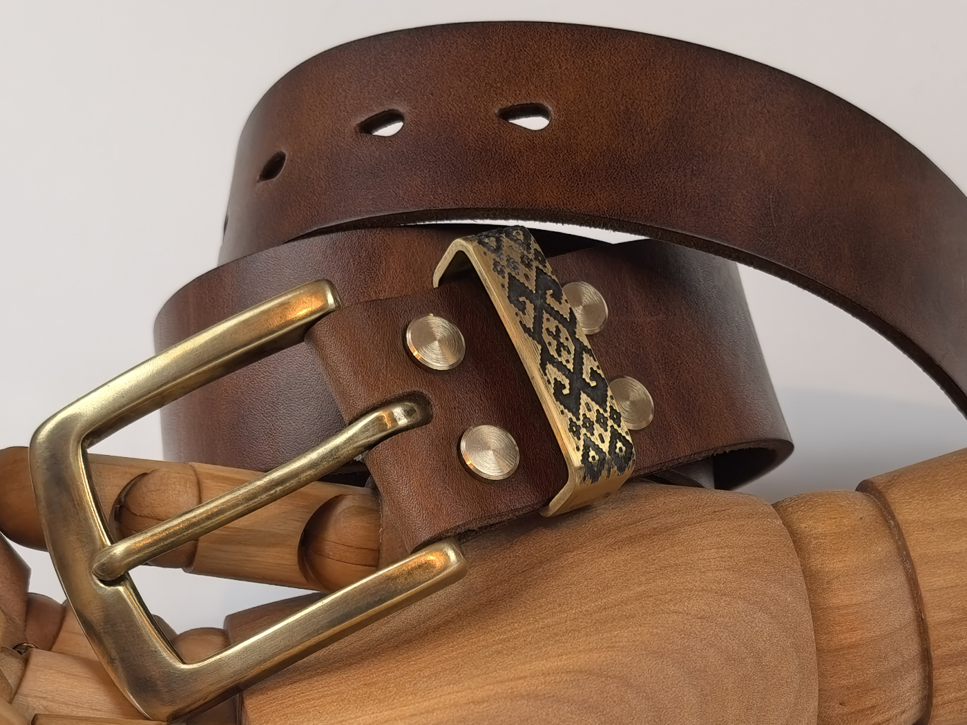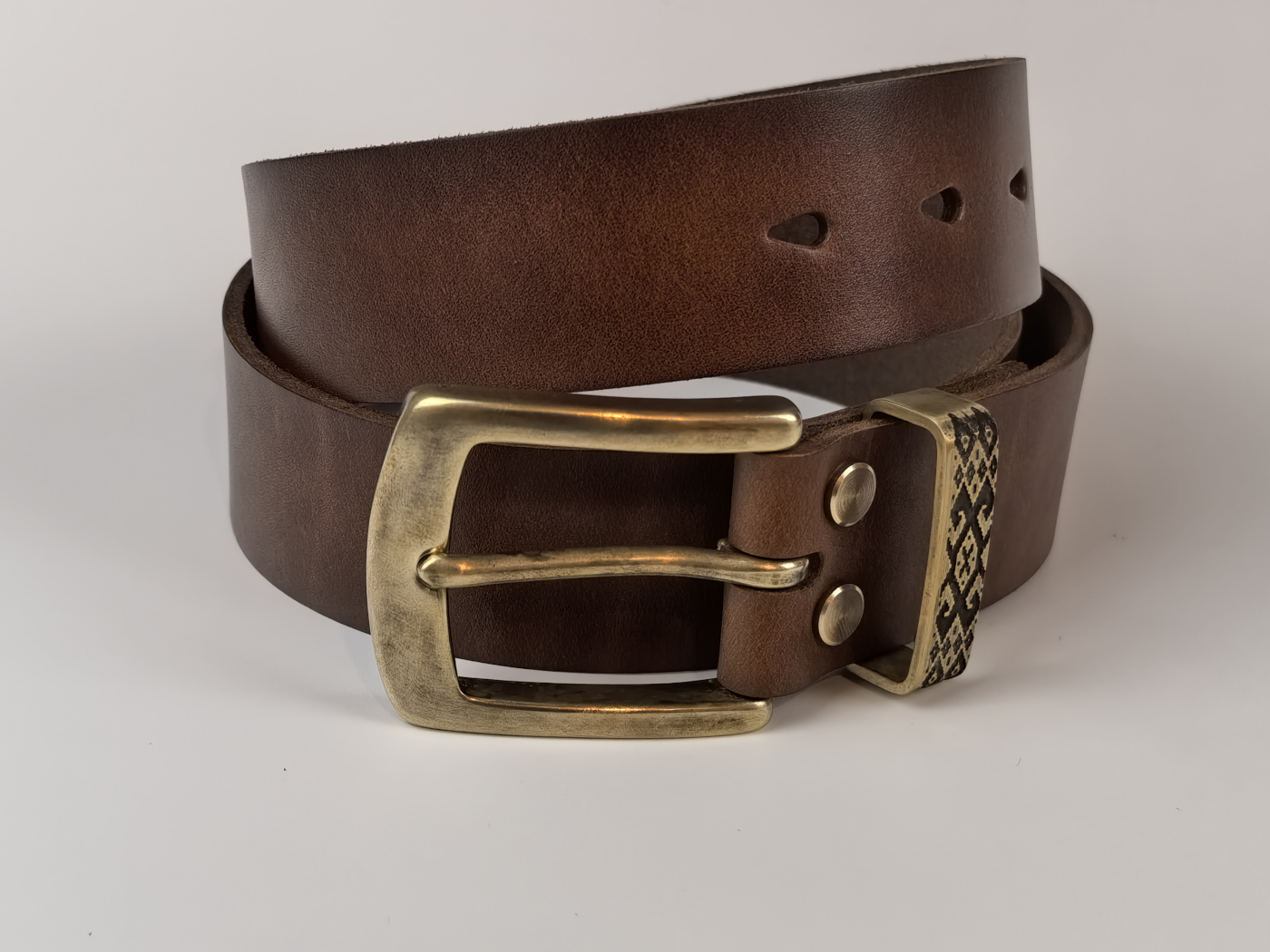 • Літая спражка, ніты і трэнчык з латуні (выдатная якасць). Памеры спражкі звонку: 65*53 мм. Пры выкарыстанні прыгожа старэе, пакрываючыся пацінай, і блішчыць у месцах трэння.