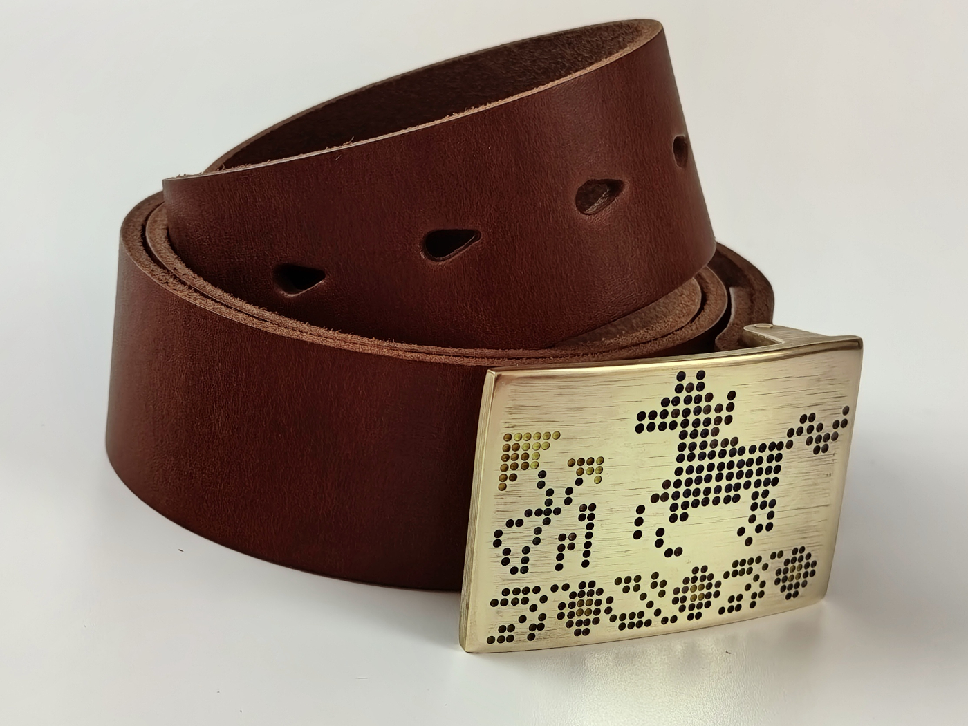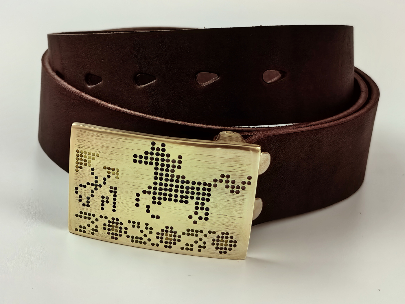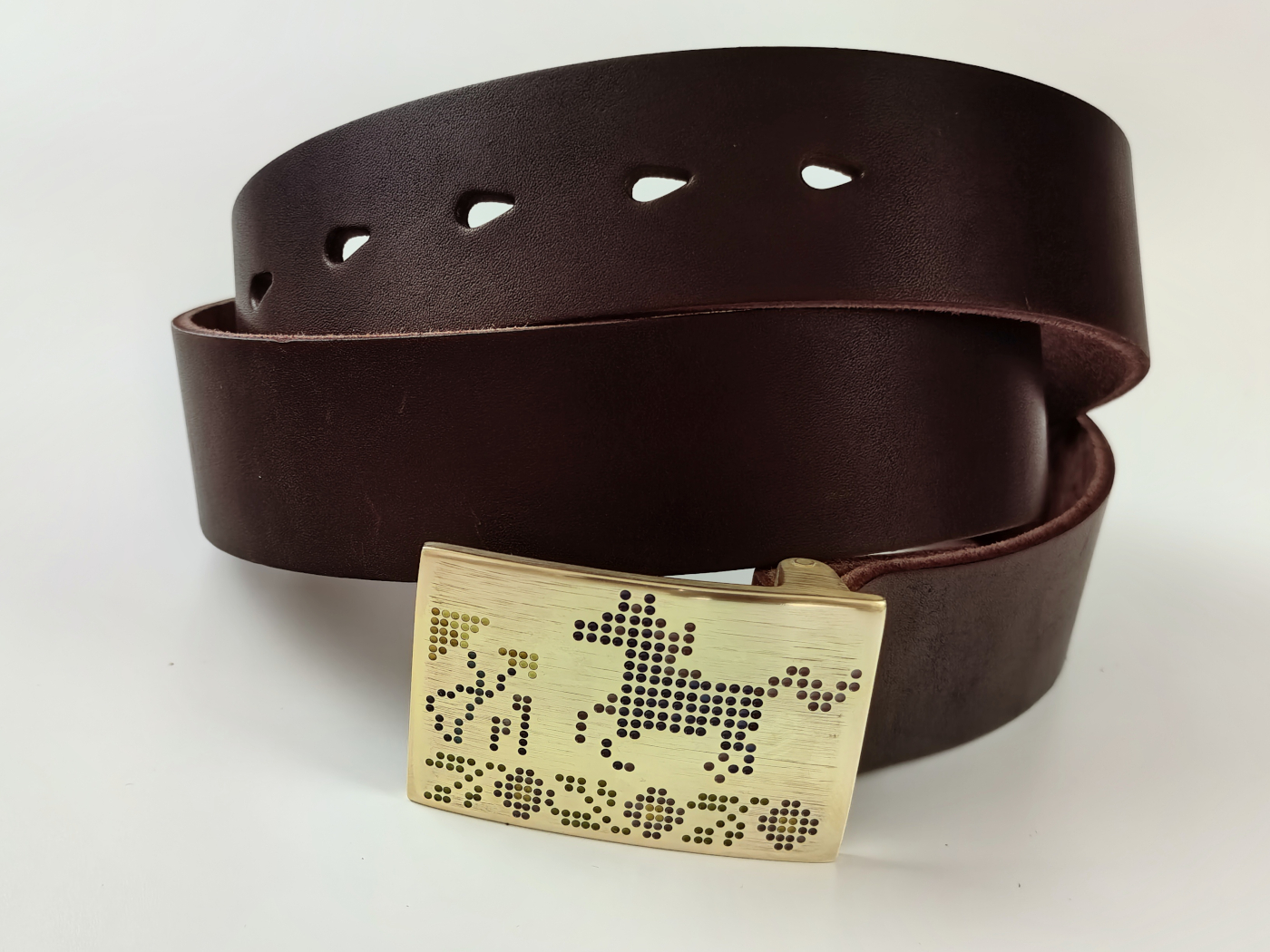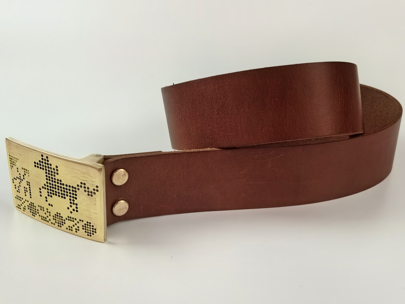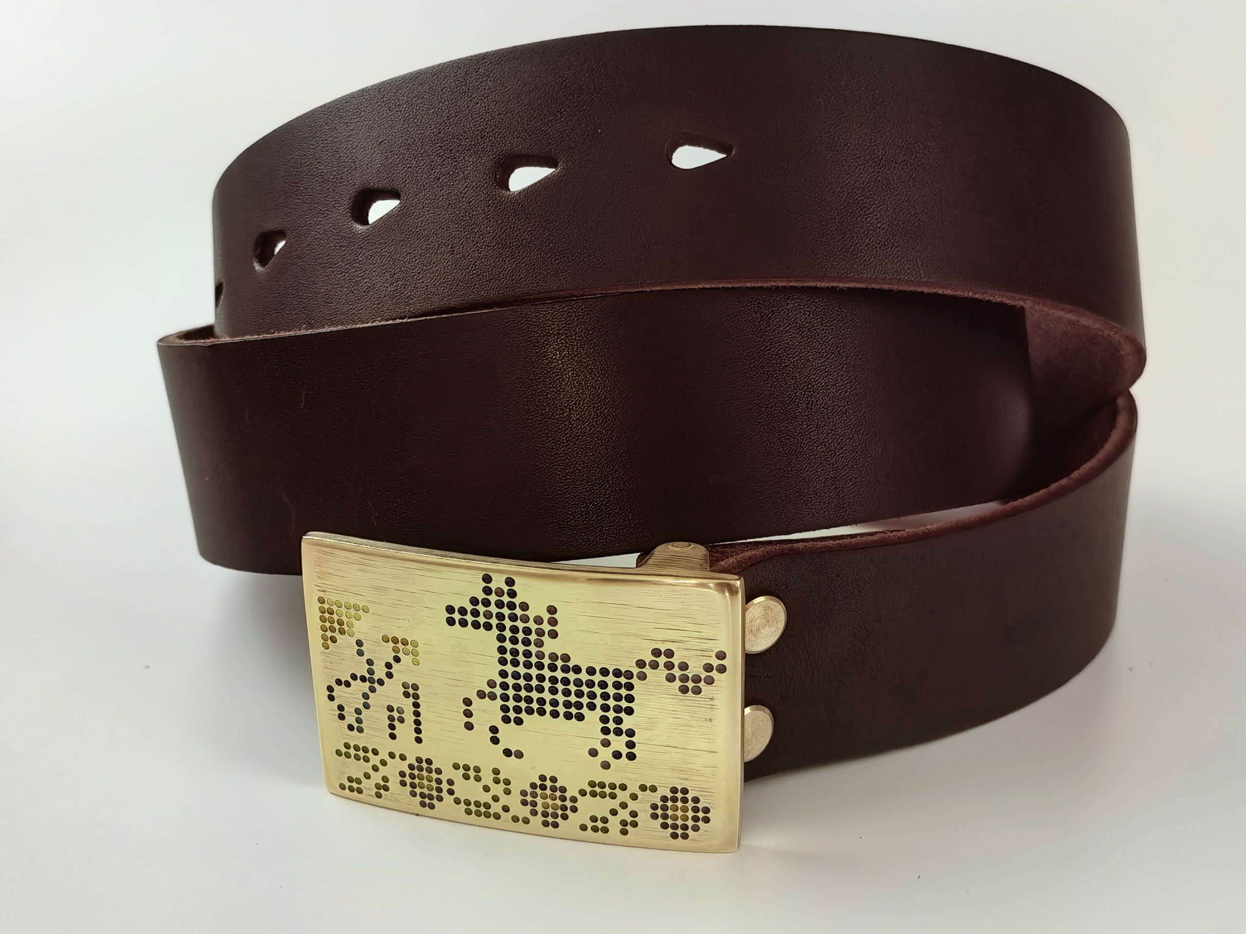 Рэмень ручнога вырабу з трывалай натуральнай скуры. Шырыня 39мм. Ніты і спражка з літой латуні і гарачай эмаллю.