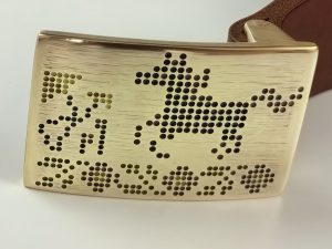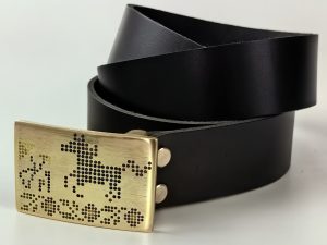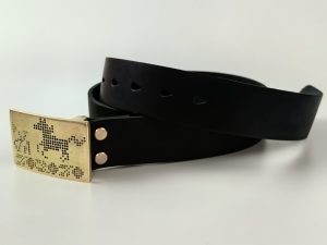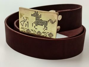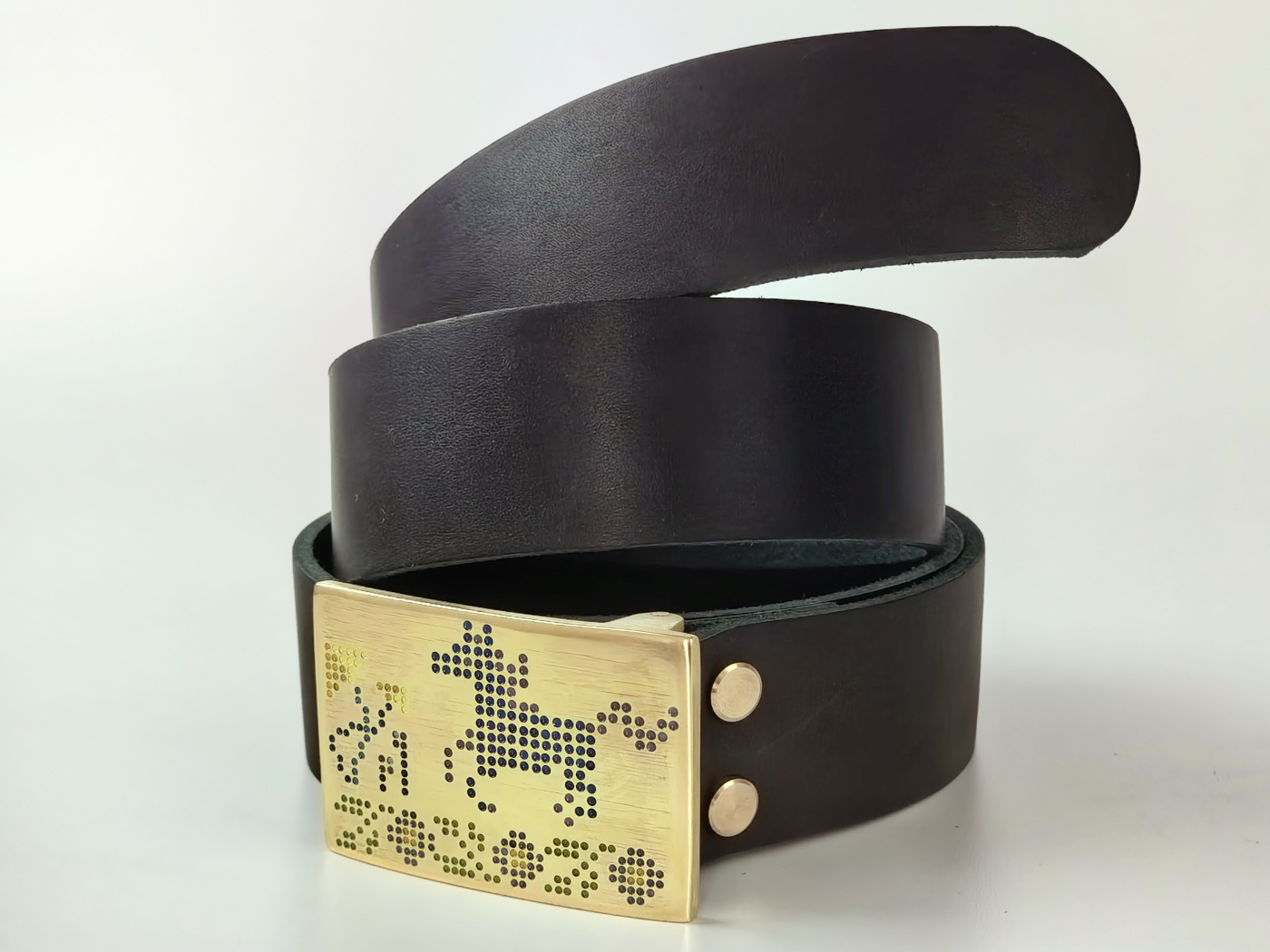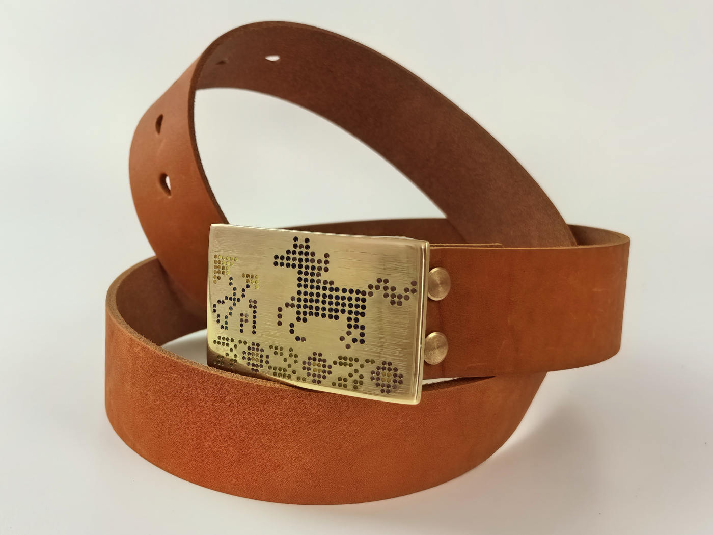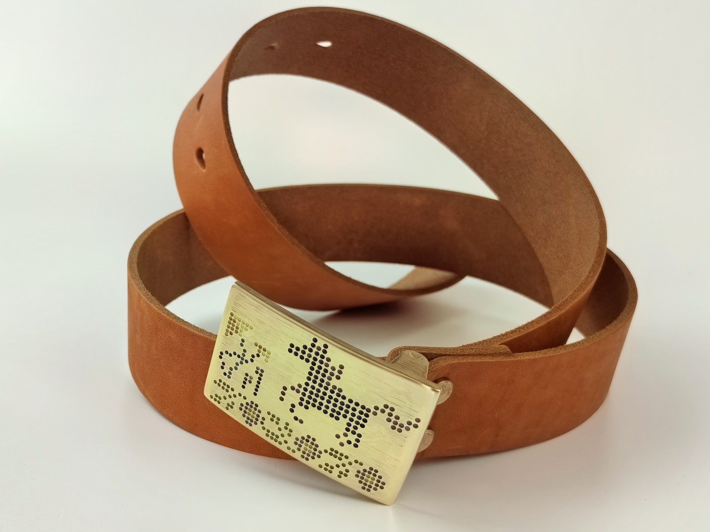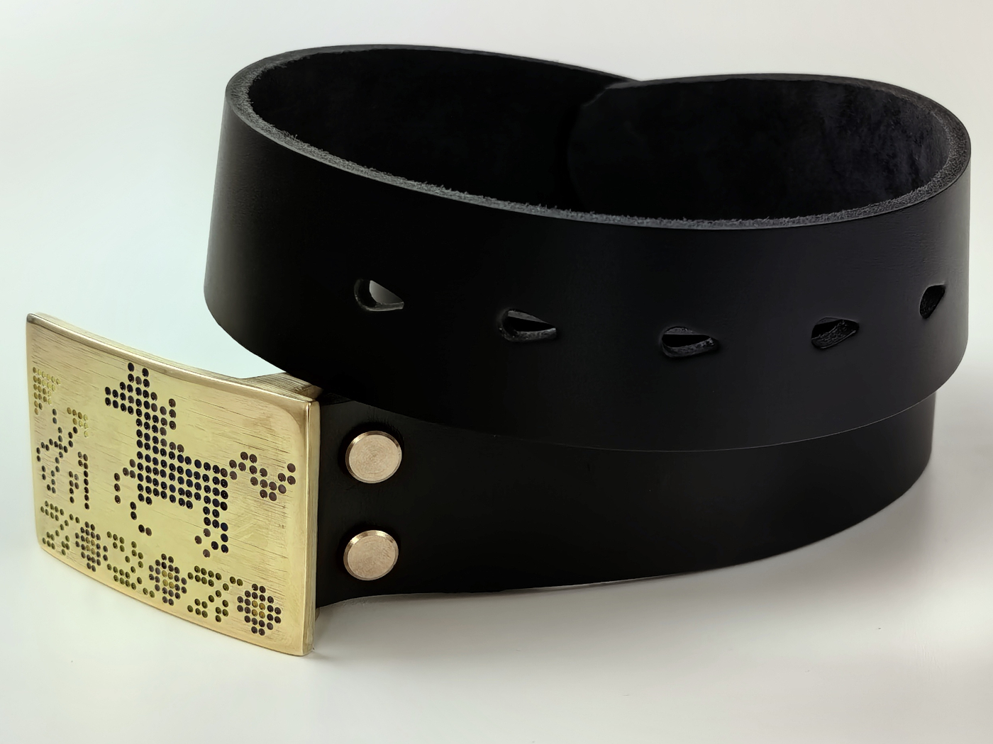 Рэмень ручнога вырабу з трывалай натуральнай скуры. Шырыня 39мм. Ніты і спражка з літой латуні і гарачай эмаллю.