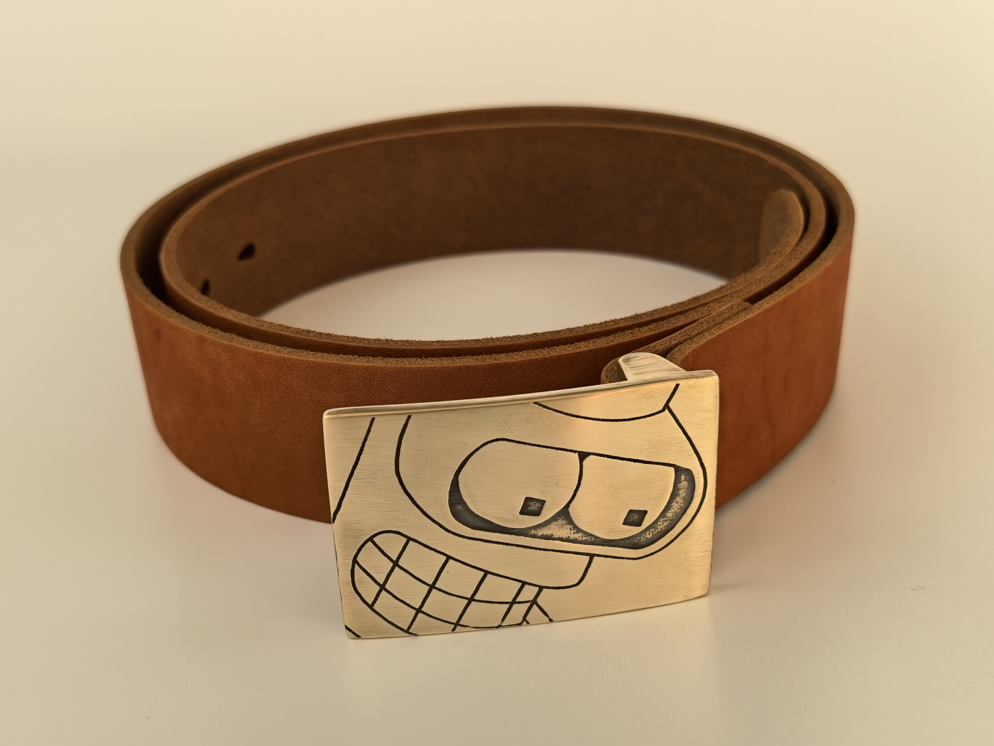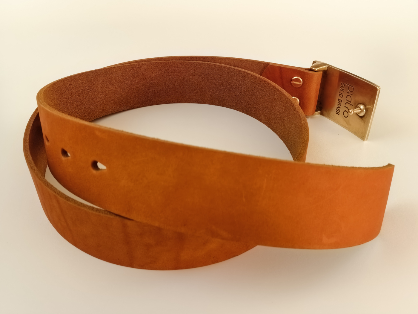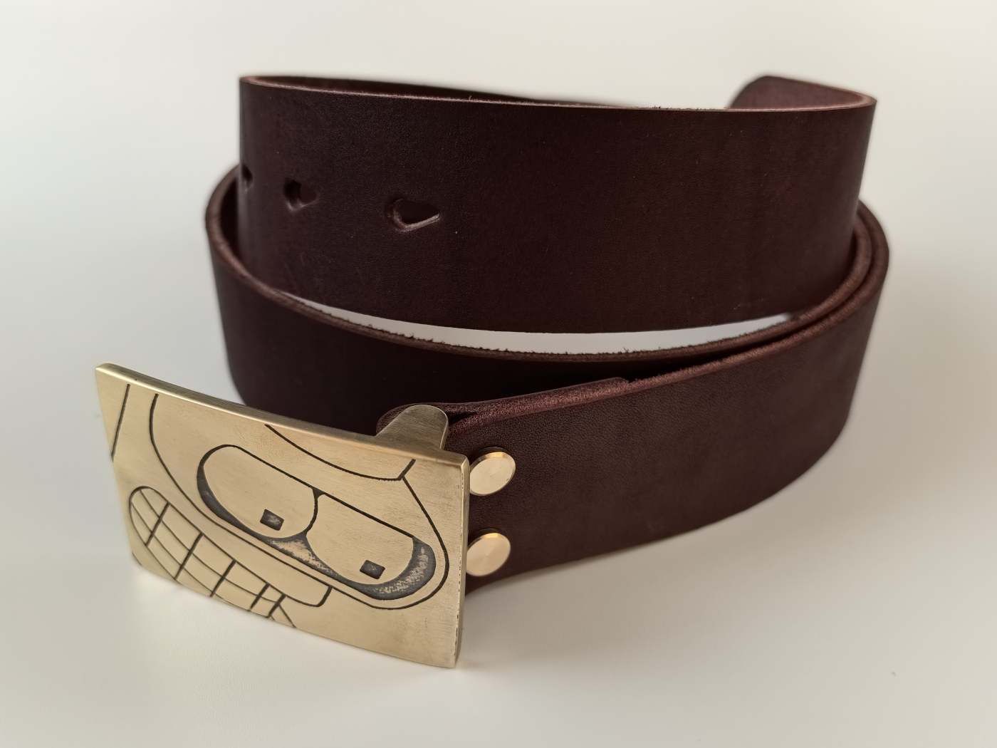 Рэмень ручнога вырабу з трывалай натуральнай скуры. Шырыня 39мм. Ніты і спражка з літой латуні глыбокай гравіроўкі.
